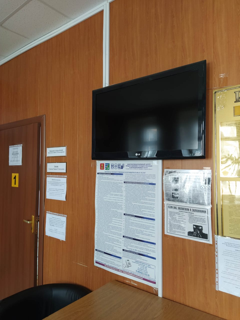 Коридор здания оборудован мнемосхемой, тактильной дорожкой, пиктограммами, тактильными табличками и табличками с азбукой Брайля, в холле размещено информационное табло и ИПСС (информационно правовая справочная система).